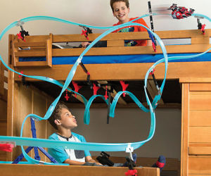 Create gravity-defying tracks at virtually any location imaginable using the mount anywhere monorail racer. This 65-piece set enables you to design monster tracks full of bends, twists, dips, and loops in endless configurations.